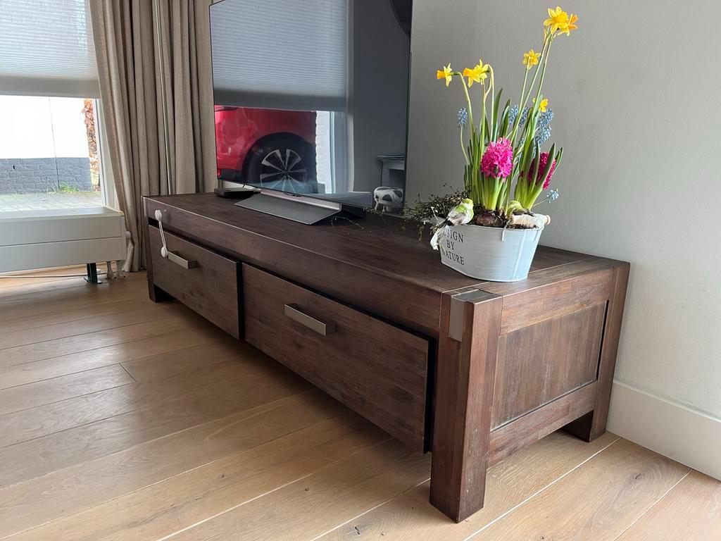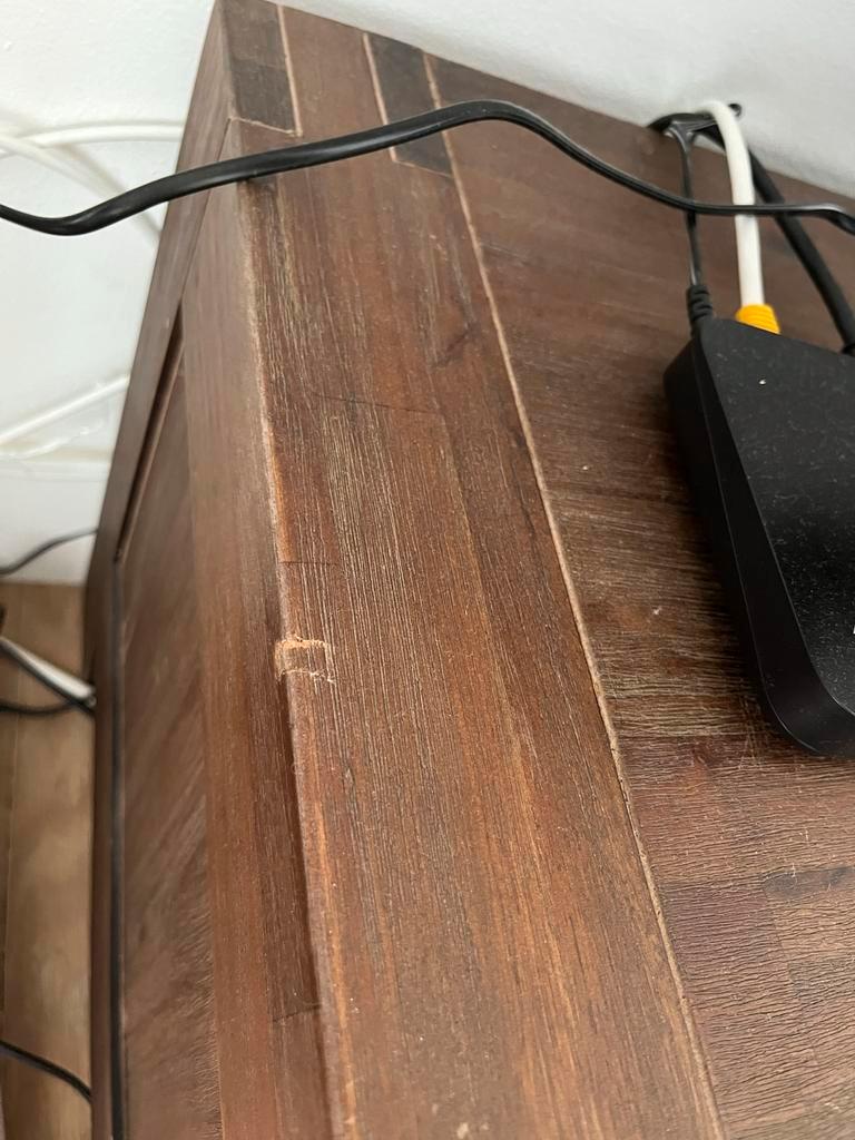 Donker gekleurd houten tv meubel. Lichte beschadigingen. Gratis af te halen.