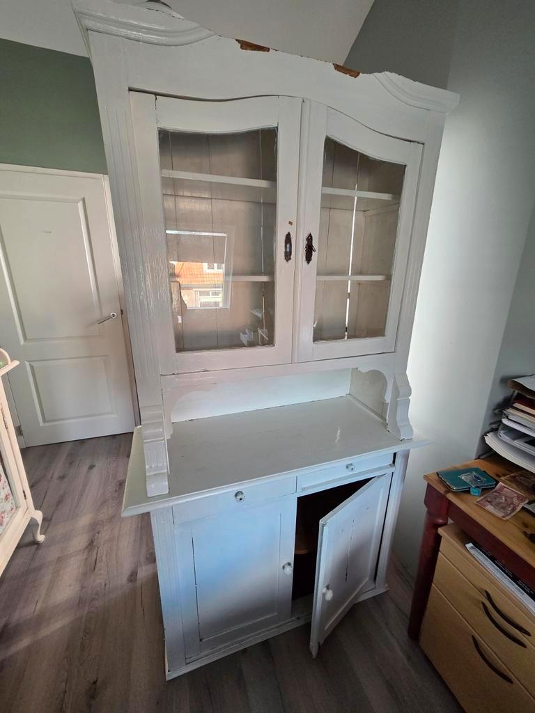 Mooie grenen buffetkast met glazen deuren. De kast heeft veel opbergruimte en is ideaal voor in de woonkamer of keuken. De kast is in gebruikte staat, de bovenste kuif is eraf gezaagd, maar kan nog pr
