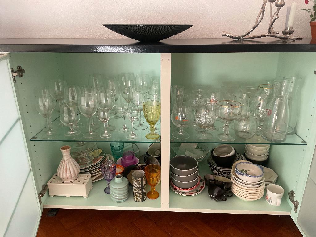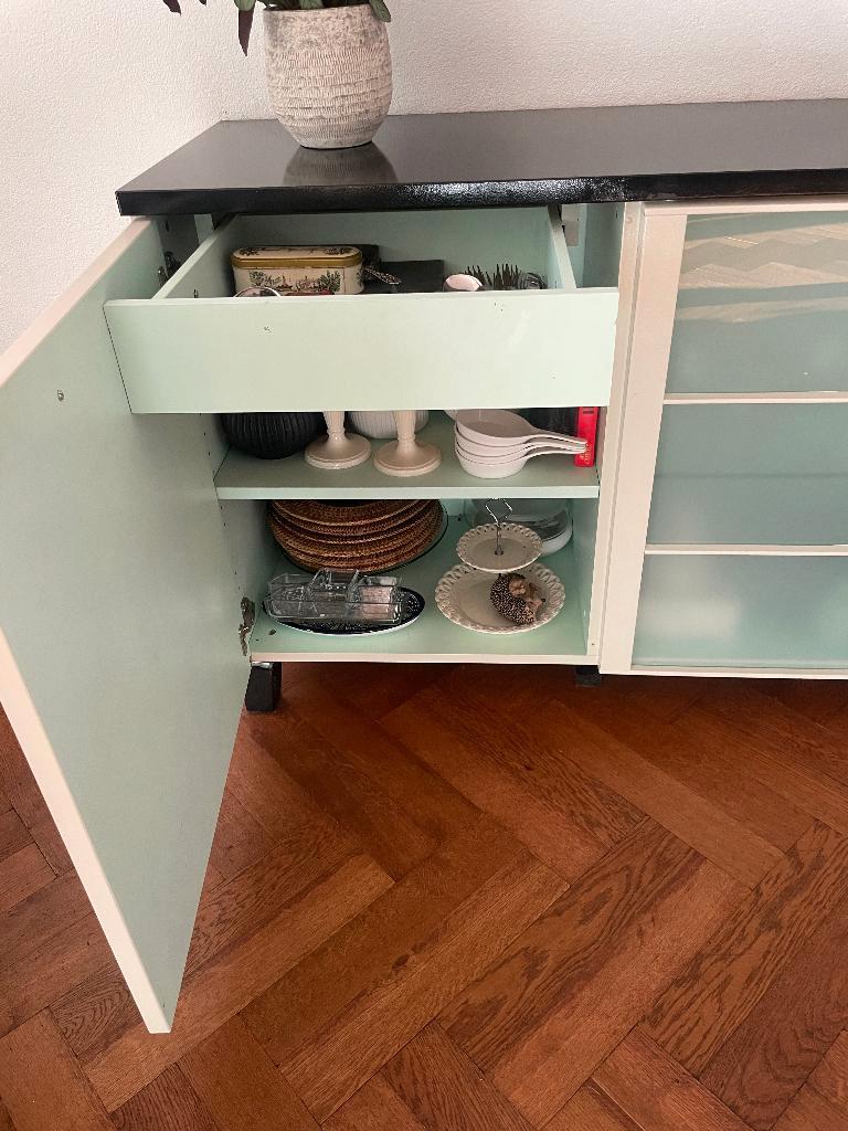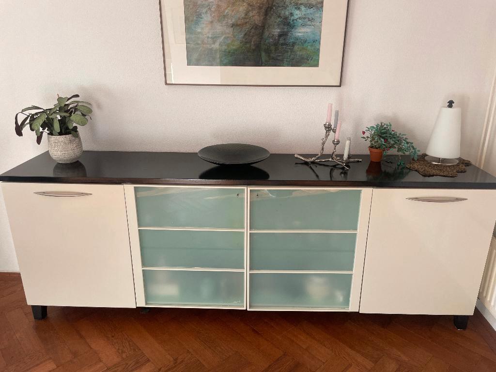 Dressoir met 4 vakken, zwart bovenblad, l x d x h 2.48 X 0.48 X 0.90 Meter 2 vakken met lade en leg plank 2 vakken met glazen leggers