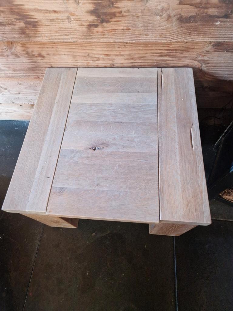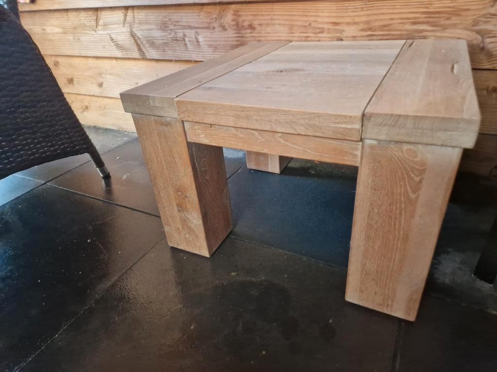 Catena salontafel van pronto wonen. Afmetingen 60x60x40 cm. De tafel heeft een tijdje buiten onder een overkapping gestaan en is daardoor wat uitgezet door vocht. Het is een stevig tafeltje, maar heef