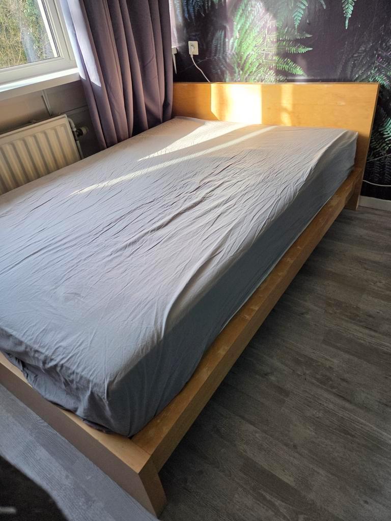 Ikea malm bed, laatste jaren gebruikt als logeerbed. Lattenbodem mist een latje en sommige latjes niet meer heel, nog wel zo gebruikt, wellicht te herstellen of lattenbodem vervangen. Matras is net ge