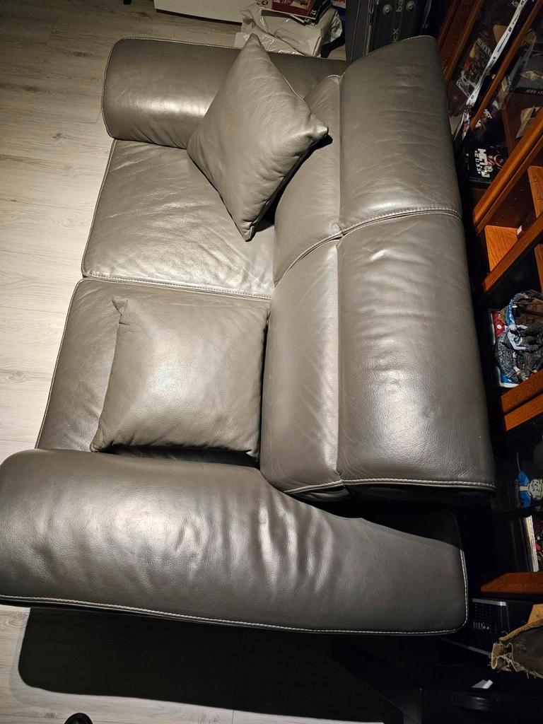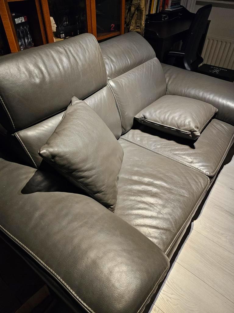 Mooie, complete lederen grijze bank te koop. De bank is in goede staat, zonder beschadigingen. Het is een 2-zits bank met een breedte van 1.70 Meter en een diepte van 1 meter. Inclusief 2 lederen kuss