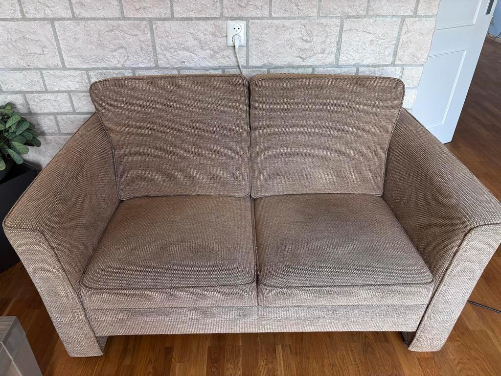 Comfortabel 2-zits bankje bekleed met een zachte stof. Ideaal voor kleinere ruimtes of als extra zitplaats. De bank is in goede staat en biedt een fijne zitervaring. Perfect voor een gezellige zithoek