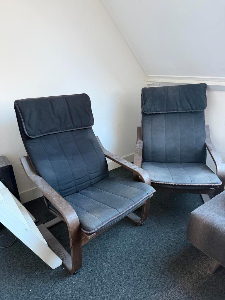 Twee ikea poang stoelen gratis af te halen. Ze zijn stoffig en hebben wat verkleuring door de zon, maar zijn verder weinig gebruikt. Ideaal voor een studentenkamer of als extra zitplaatsen.