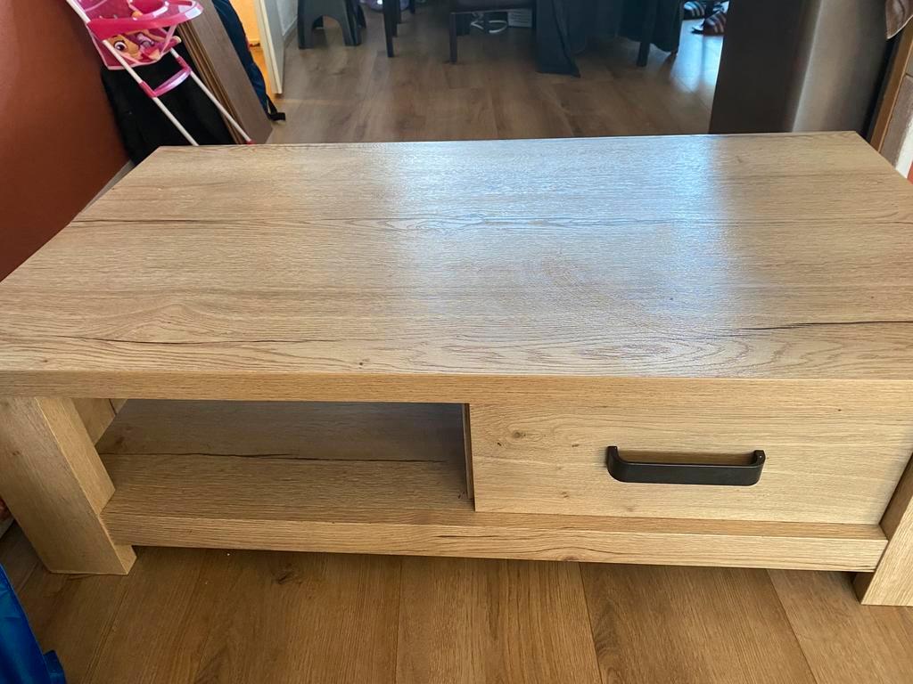 Mooie eiken salontafel maat 124x67x37 kleine beschadiging aan de poot, maar niet storend. Gratis ophalen in hellevoetsluis
