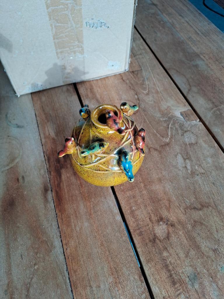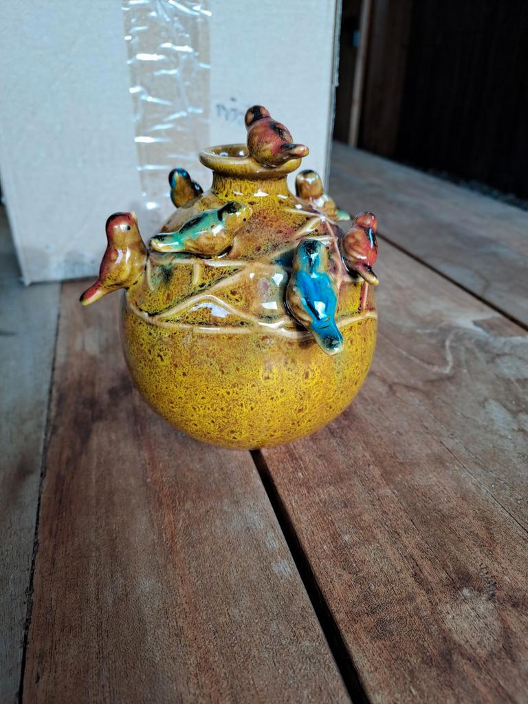 Klein vaasje met vogeltjes erop.