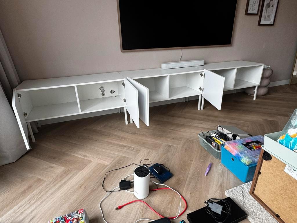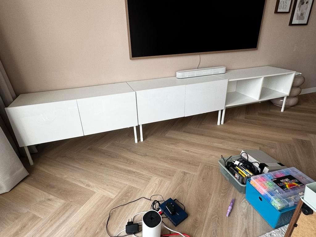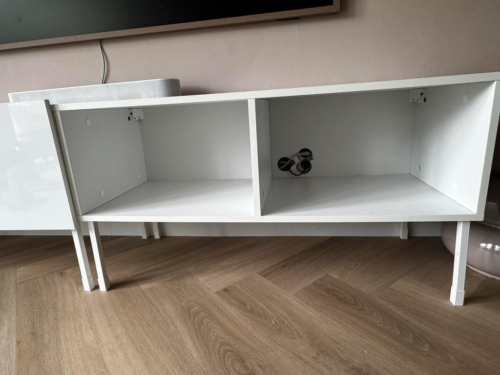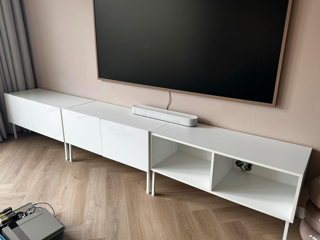 Drie tv-kasten, elk 1 meter breed. Twee kasten hebben deurtjes met een hoogglans afwerking, de derde kast is open. Ze staan op pootjes. Gratis af te halen!