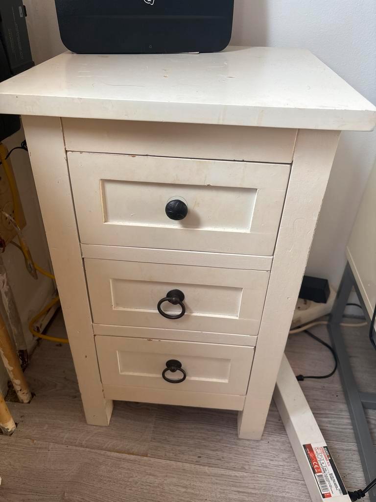 Gratis af te halen: een wit nachtkastje met 3 lades. Gebruikt, maar in goede staat. Ideaal voor extra opbergruimte naast je bed. Afmetingen: zie foto''s.