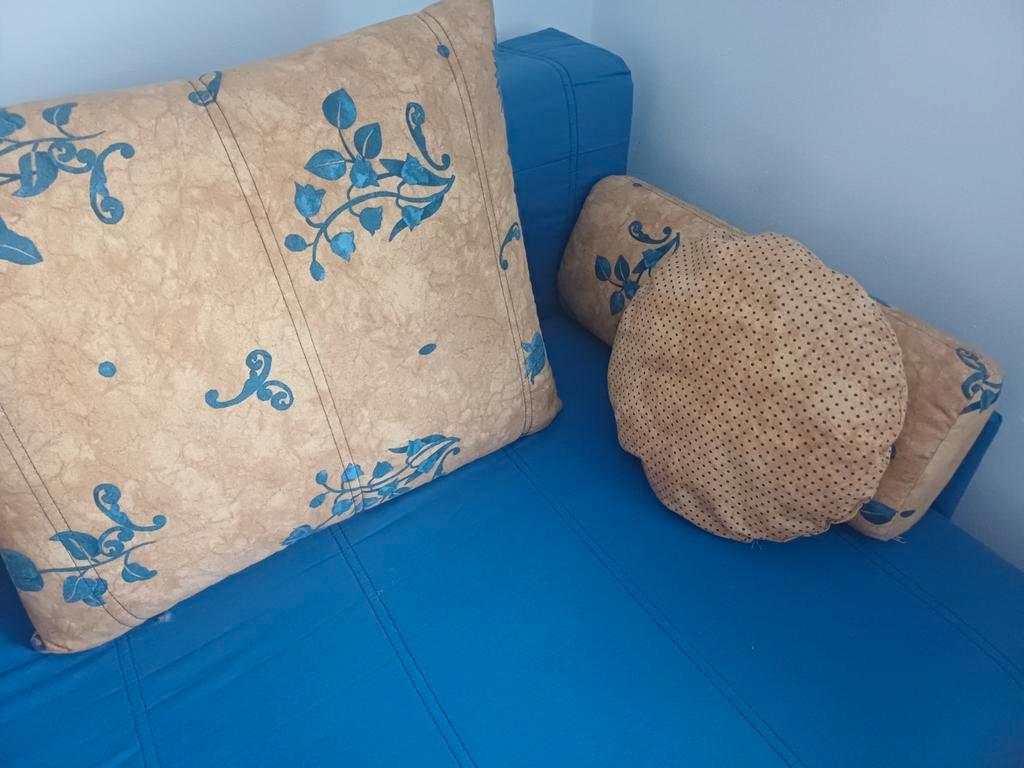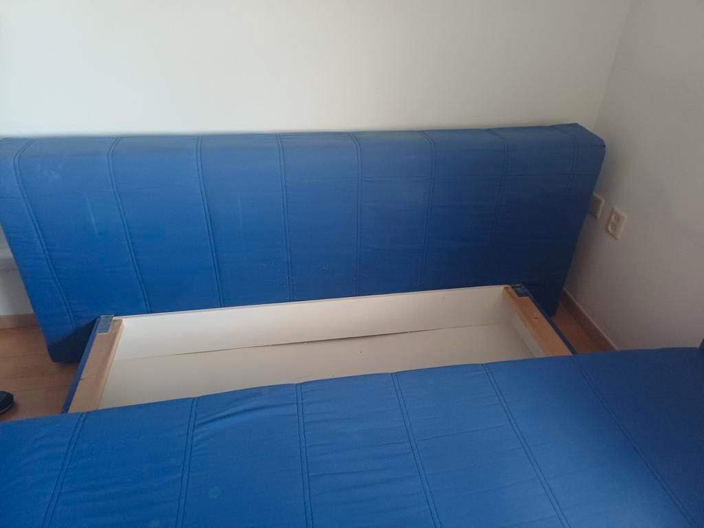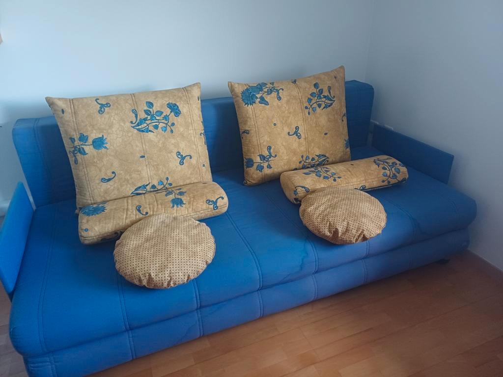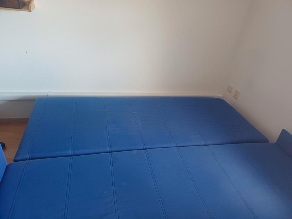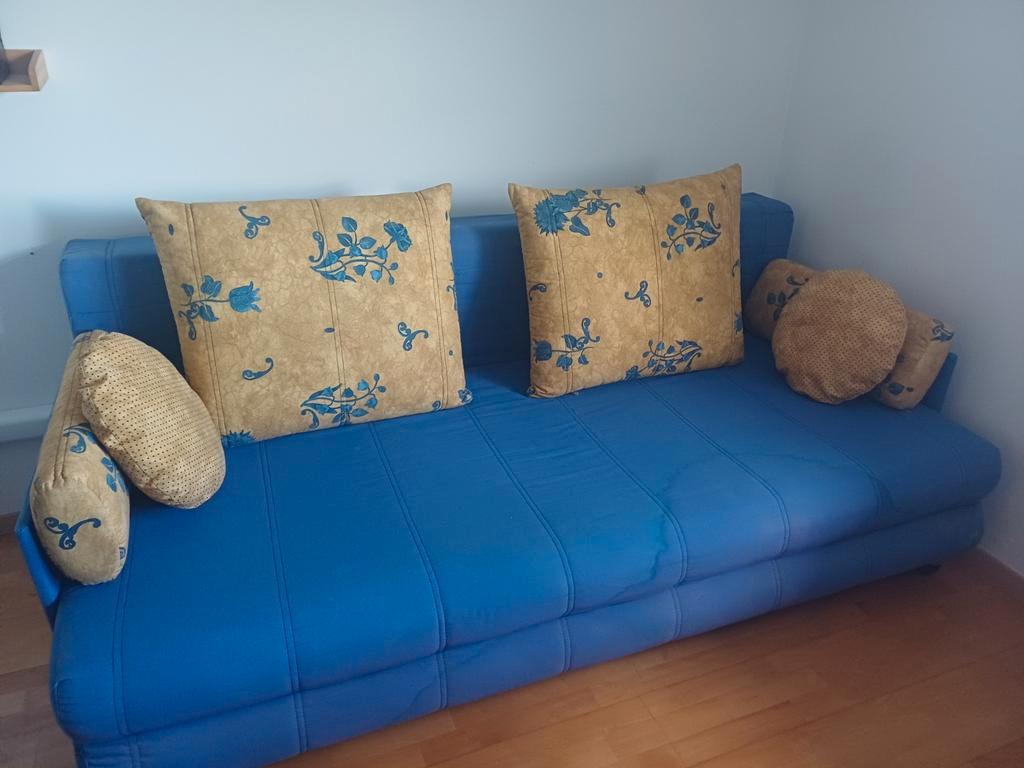 Comfortabele slaapbank in een mooie blauwe kleur. Lengte 200 cm. De bank is gebruikt, maar nog in goede staat en kan zeker nog een ronde mee. Ideaal voor logeerkamer of studentenkamer. Pluspunten: -ui
