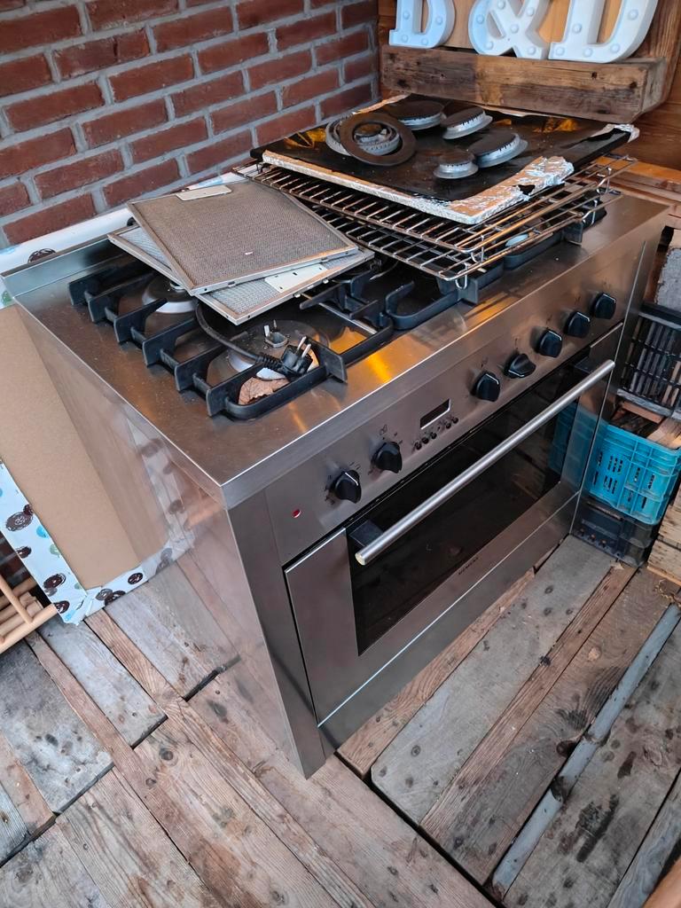 Ruim gasfornuis met oven, 90 cm breed. Ideaal voor de grotere keuken of de enthousiaste kok. Biedt voldoende ruimte voor al uw culinaire creaties. Gebruikerssporen aanwezig. Bij de oven is de rubberen