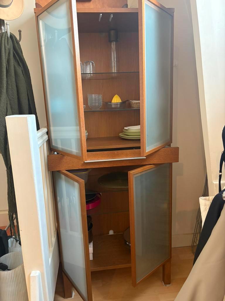 Free – glass-front cabinet (pickup asap) modern wood cabinet with frosted glass doors. Good condition. Free – must go asap. Pickup only. 4Th floor, dutch stairs (narrow/steep), no elevator. Bring help