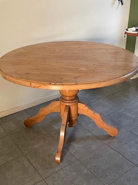 Ronde eettafel, gratis af te halen. Diameter is ca. 1.15 Mtr, hoogte is ca. 0.78 Mtr. Even opschuren en deze zeer stabiele tafel kan nog jaren mee.