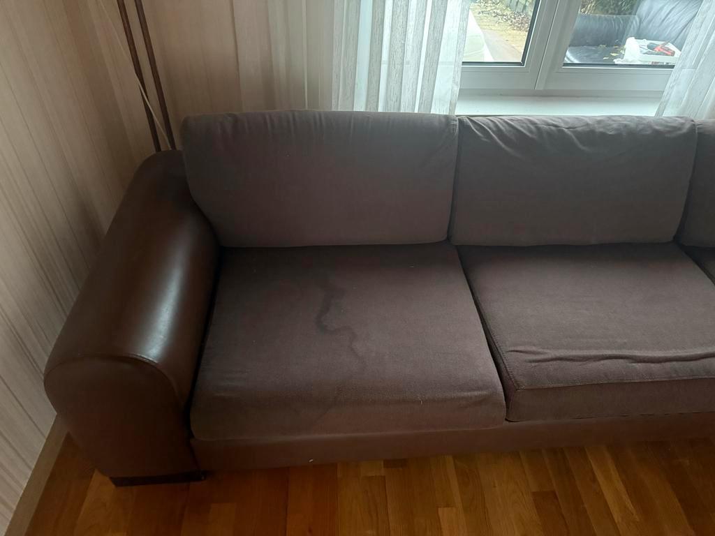 Ruime hoekbank, ideaal voor grote gezinnen of wie van veel ruimte houdt. De bank is in gebruikte staat, maar nog steeds comfortabel. De bekleding is van stof. Perfect om heerlijk op te relaxen!