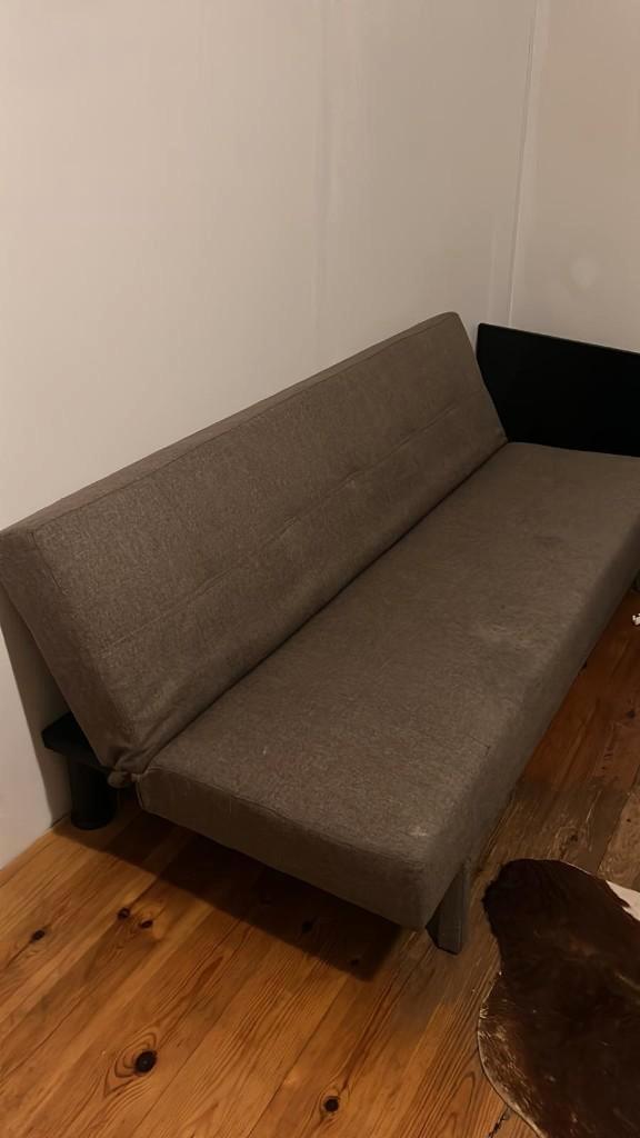 Slaapbank. Uitgeklapt is de slaapbank 180 lang en 110 breed. Grijsachtig van kleur met zwart onderstel. Eventueel mag de topper ook meegenomen worden (let op, deze is wel iets groter dan de bank). Gra