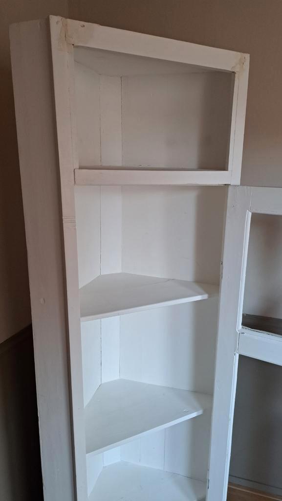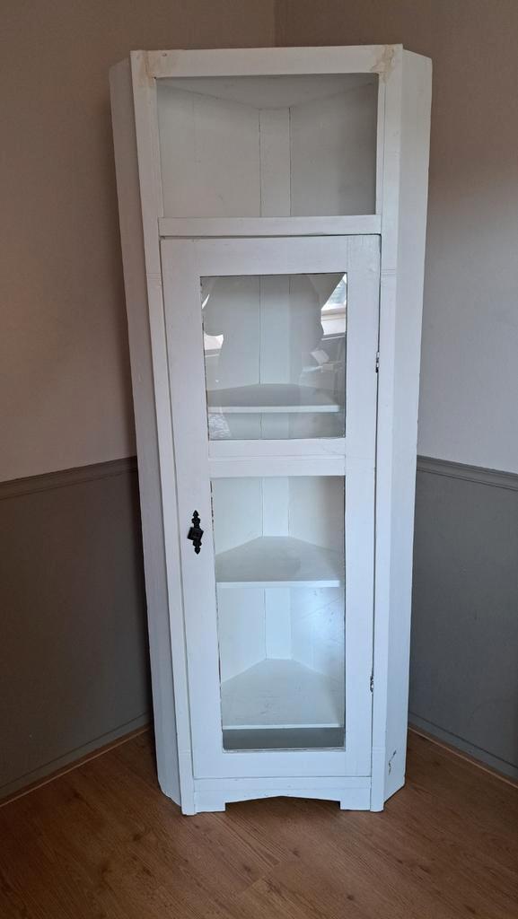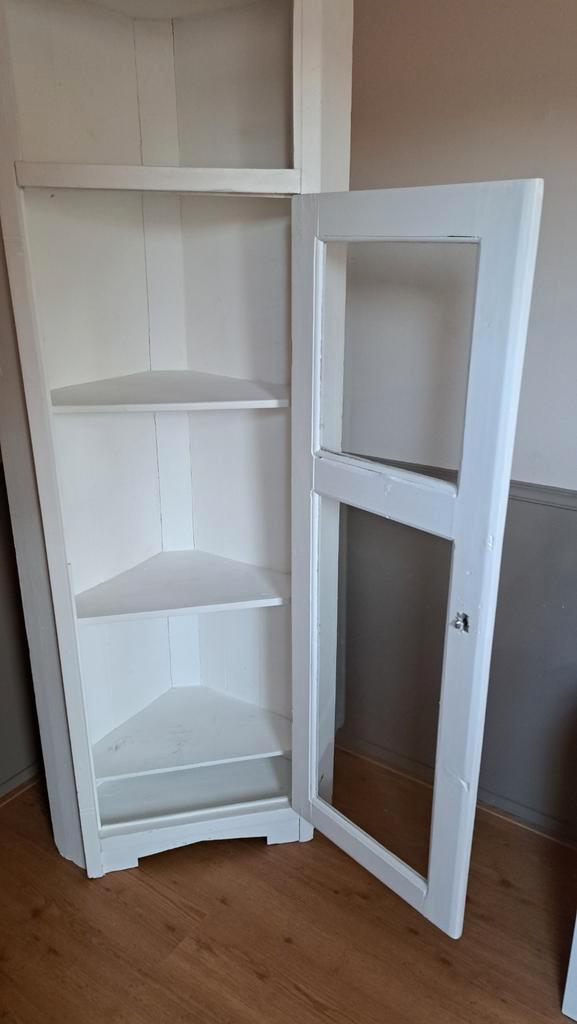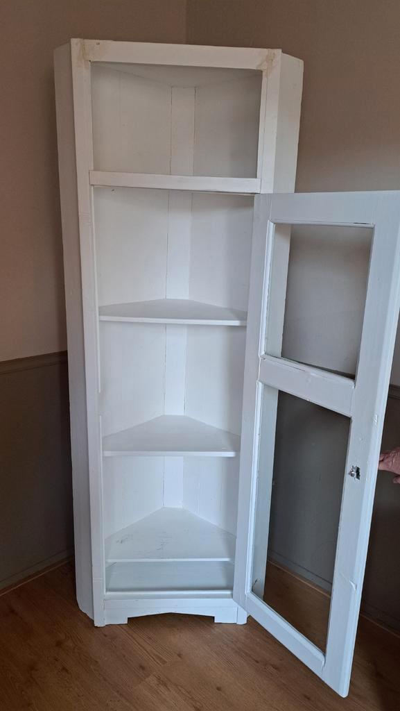 Witte landelijke hoekkast die wat liefde en een opknapbeurt nodig heeft.. Afmetingen: hoogte: 185 cm diepte: 41.5 Cm vanaf midden achter naar voor. Breedte: 50 beide zijden langs muur breedte voorkant