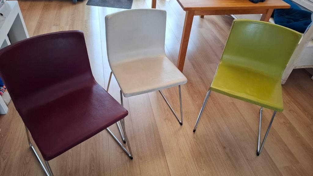 Drie eetkamerstoelen van ikea: paars, wit en groen. De stoelen zijn veel gebruikt en mogen dan ook gratis afgehaald worden, vanaf 20 februari.