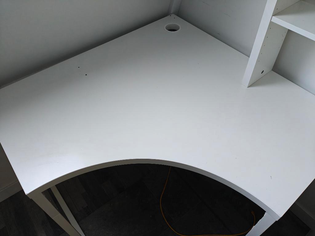 Ikea micke - hoekbureau 100x100cm. Paar kleine miniscule beschadigingen, zie foto, zijn maar enkele puntjes. Verder in prima staat. Er is maar 1 opbouwdeel bij. Zoals op de foto. Kan opgehaald worden.