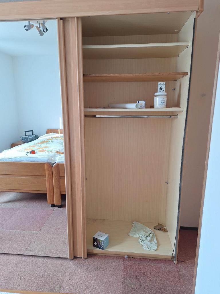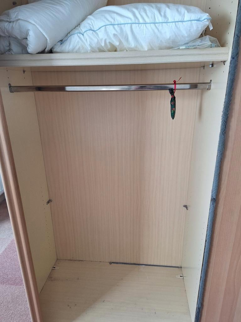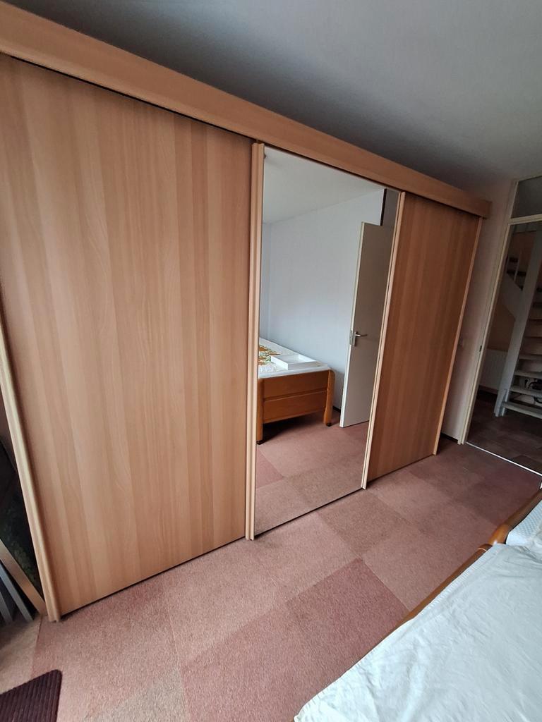 Kledingkast met drie schuifdeuren. De middelste deur is een spiegeldeur. Helaas loopt deze wel eens uit de rail. Dit is voor een handig iemand makkelijk te verhelpen. In de achterwand links is een gat