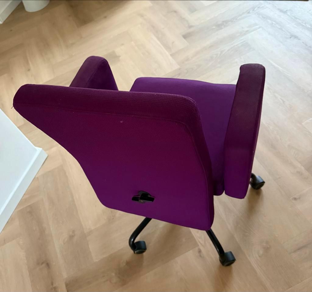 Paarse bureaustoel in gebruikte staat. Verstelbaar in hoogte. Gebruikt, maar kan na schoonmaken nog prima door.