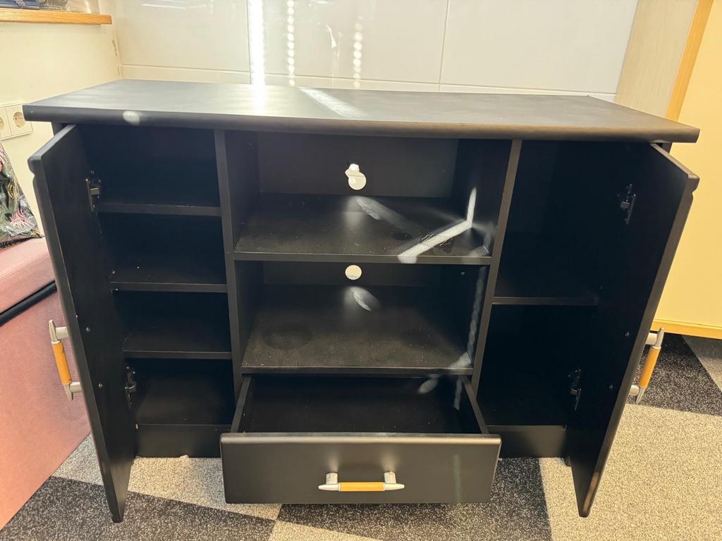 Zwart tv-meubel of dressoir met opbergruimte. Afmetingen: ongeveer 99 cm breed, 71 cm hoog en 39 cm diep. Ideaal voor het opbergen van media-apparatuur of andere spullen. Gebruikt, maar in goede staat