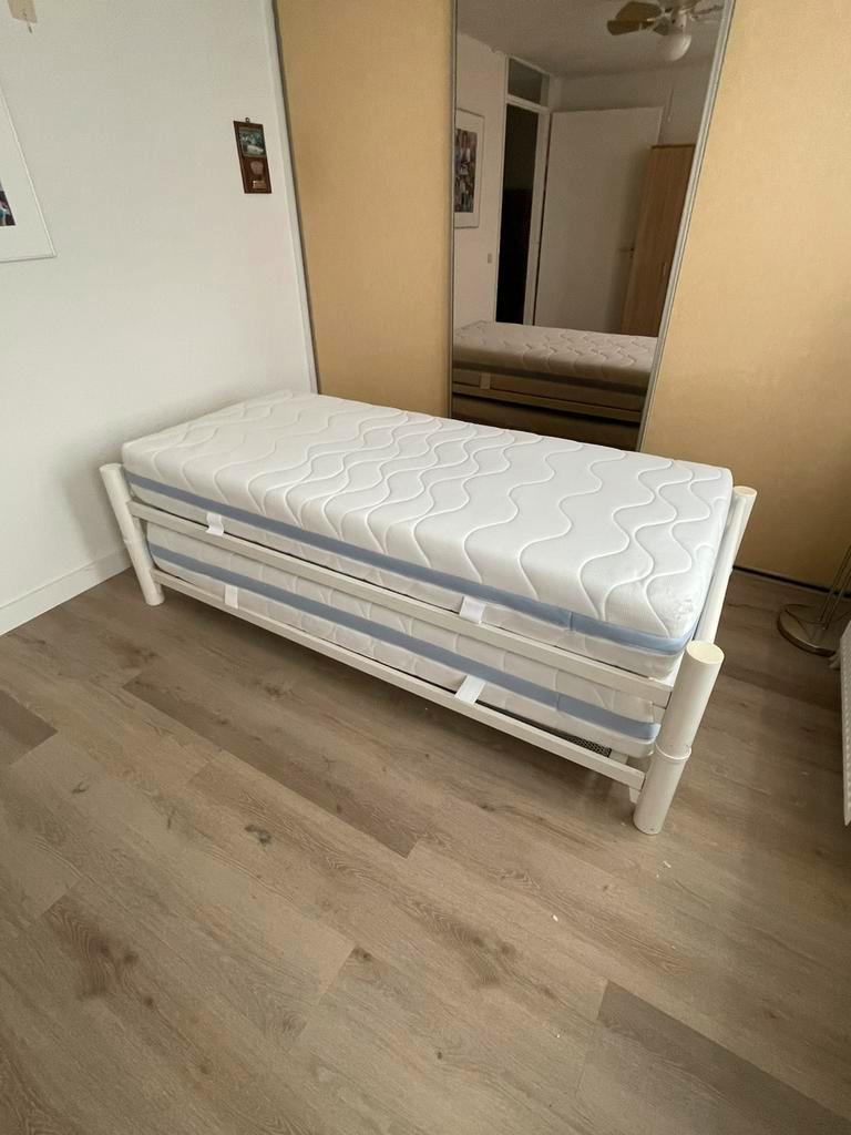 2 stapelbare logeerbedden zeer praktisch bij beperkte ruimte. Inclusief 2 matrassen (90x200) hoogte poot 31 cm, dubbel dus 62 cm breedte 100 cm, dubbel 200 cm