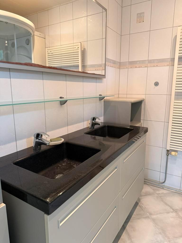 Gratis badkamer – zelf demonteren in verband met verbouwing bieden wij deze complete badkamer gratis aan. Inclusief: • dubbel wastafelmeubel met kranen • spiegel met verlichting en glaze