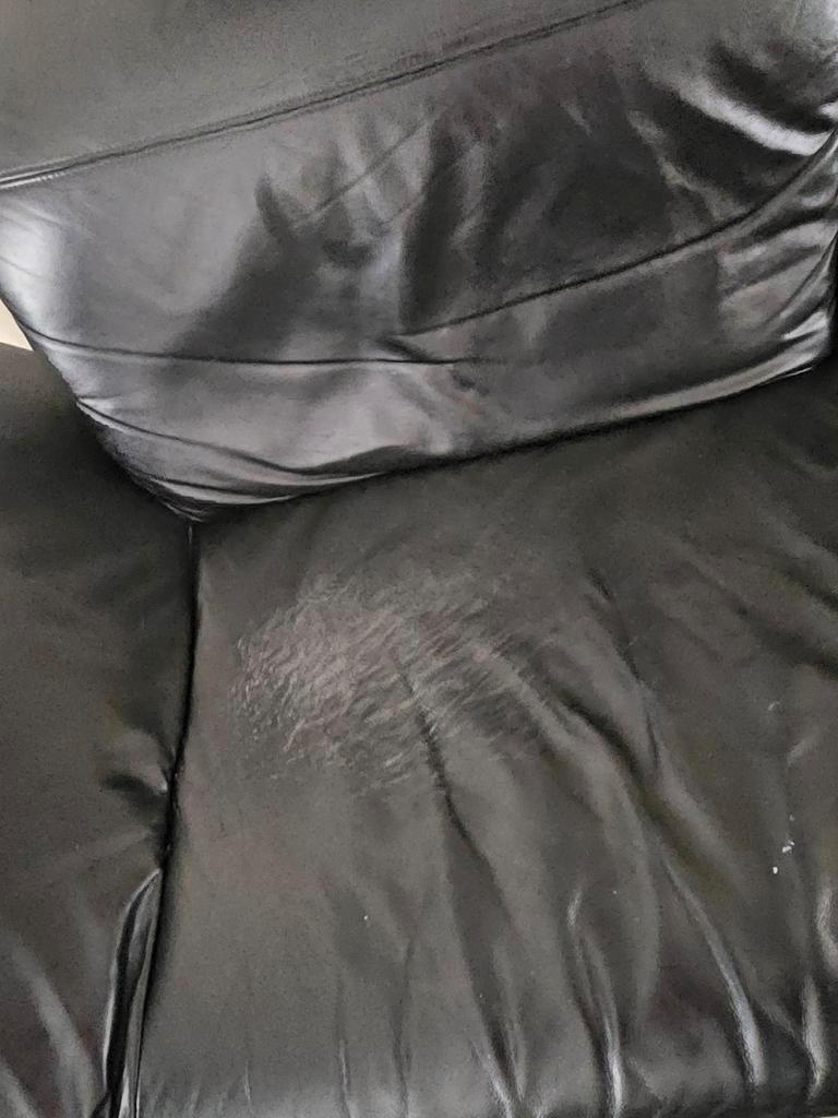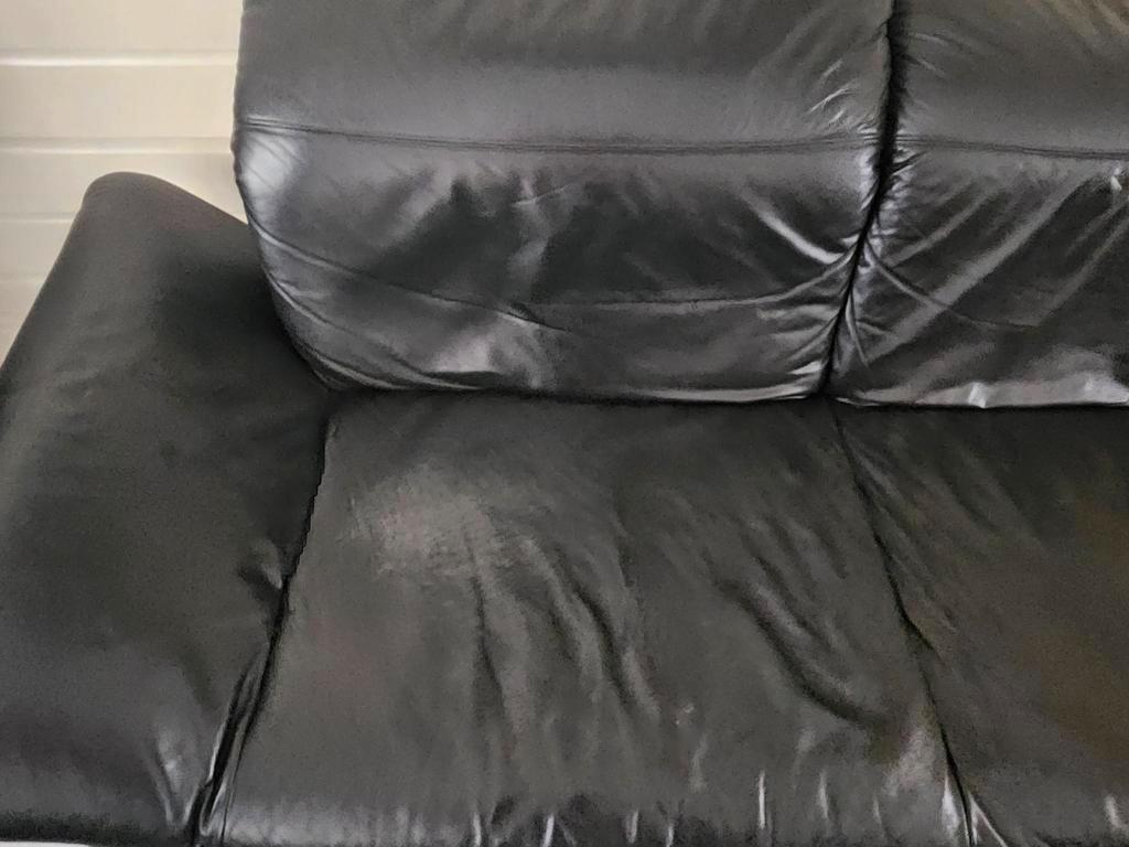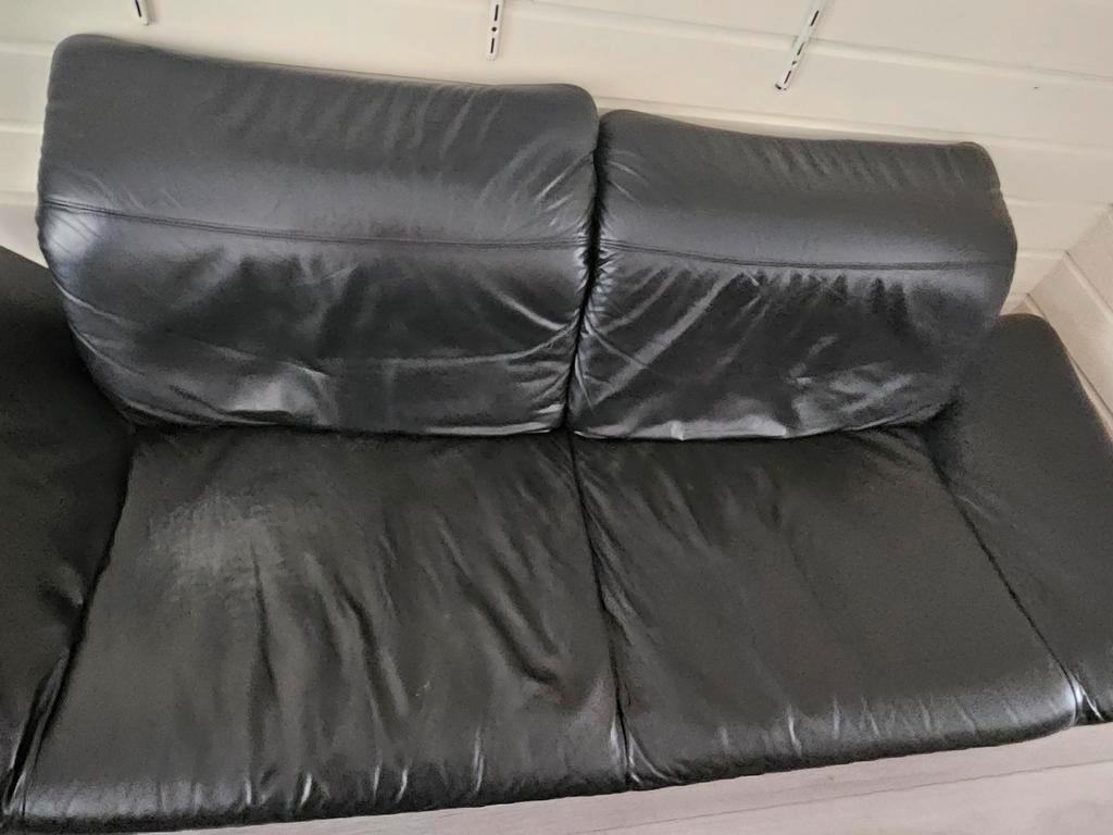 Gratis af te halen zwarte lederen bank. De bank is gebruikt. Ideaal voor een studentenkamer of als extra zitplaats.