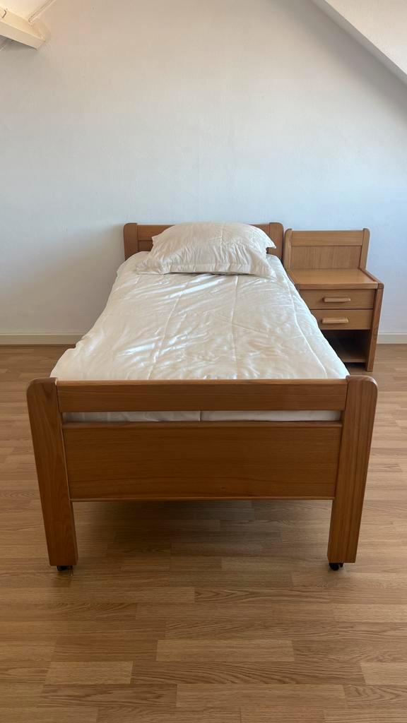 Comfortabel eenpersoonsbed, ideaal voor kleine ruimtes of logeerkamers. Het bed is voorzien van wielen, waardoor het gemakkelijk te verplaatsen is. Het bed is in goede staat en klaar voor gebruik. Mat