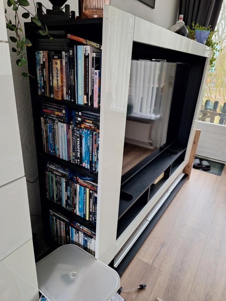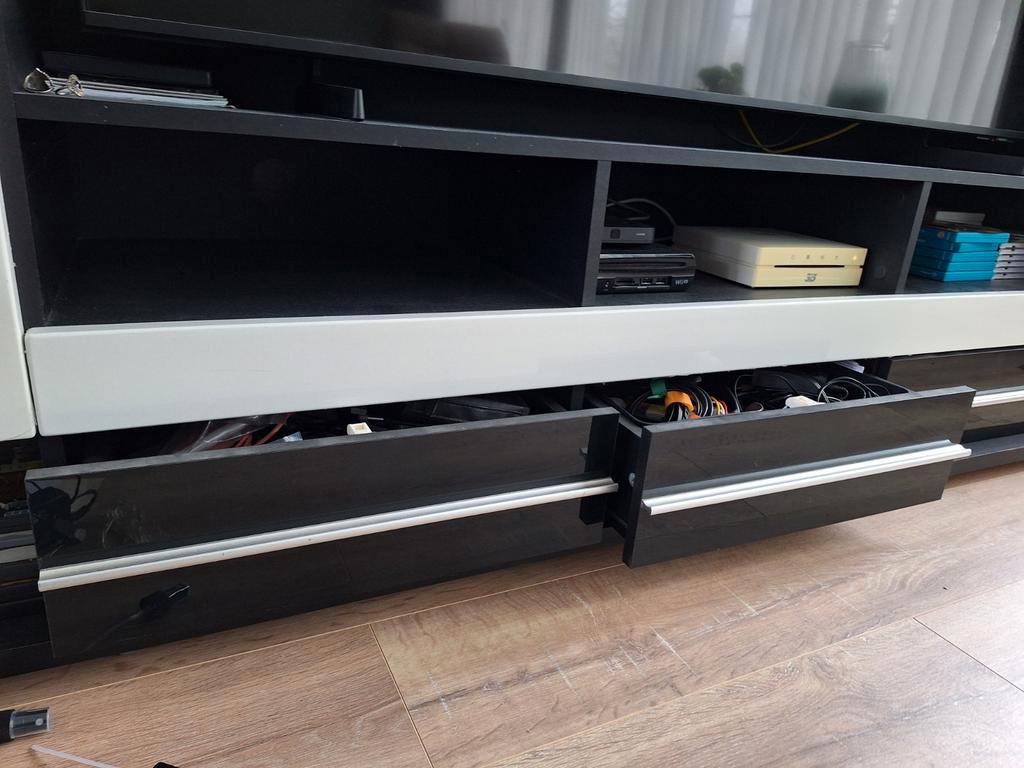 Stijlvolle mat zwart en hoogglans wit tv meubel, perfect voor uw woonkamer. Biedt voldoende ruimte voor uw grootte tv en andere apparatuur. Onderaan 3 lades. Meubel heeft enkele kleine gebruikersspore