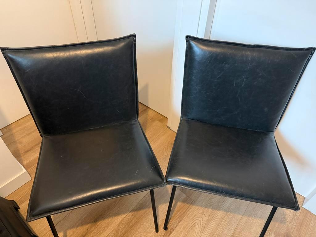 Twee donker grijze eetkamerstoelen. €10 voor beide