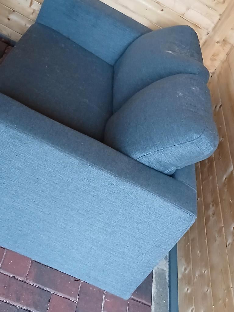 Tweezitsbankje in antraciet (lijkt blauw op de foto). De bank is in goede staat, zonder vlekken of beschadigingen. Eén pootje moet opnieuw gemonteerd worden, maar deze is aanwezig. Ideaal voor een kle