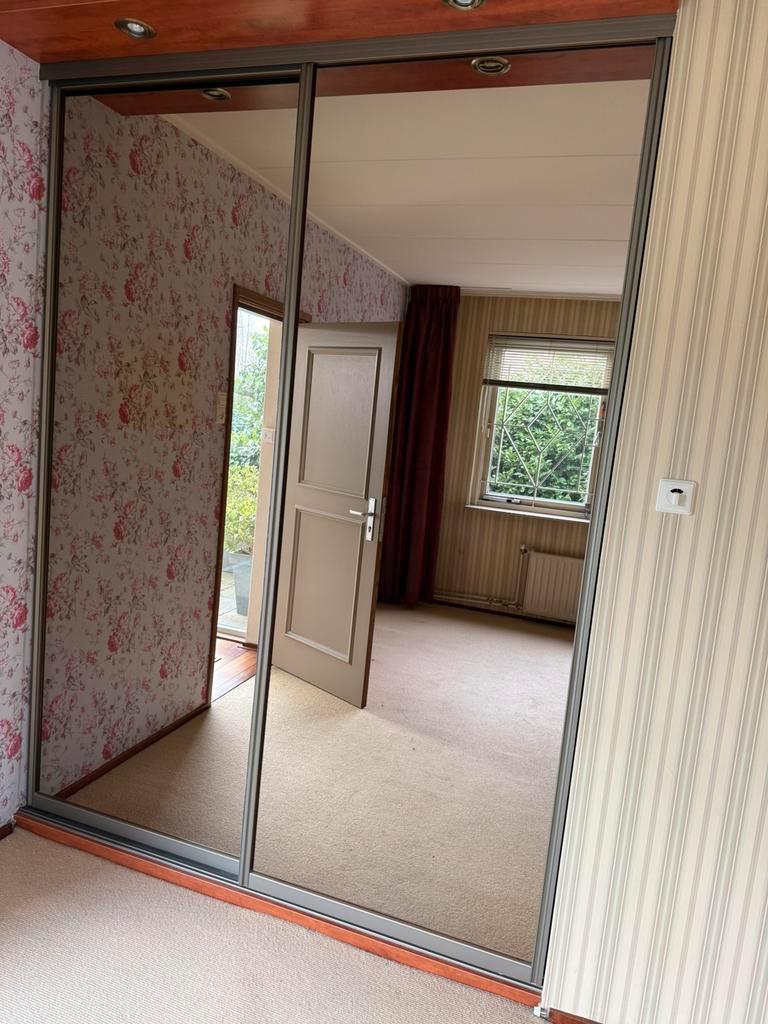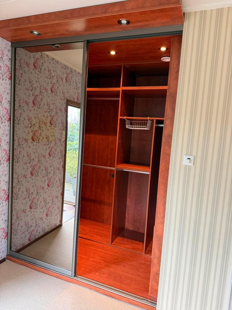 Inbouw garderobekast – gratis af te halen stevige inbouw garderobekast met schuifdeuren (spiegel) en complete indeling. Kast is in nette staat en bestaat uit meerdere legplanken, hanggedeeltes, lades