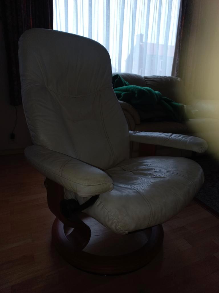 Gebruikte lederen fauteuil. Je kan dexstand instellen. Gebroken wit. Hij heeft wel gebuik sporen.