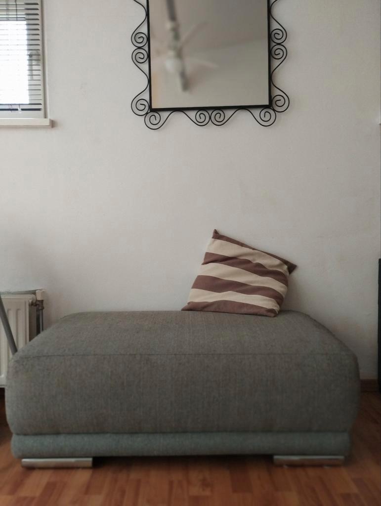 Grote grijze hocker met rvs onderstel. Wel wat beschadigingen door kat, evt. Plaid overheen te leggen. Wel stevige kwaliteit.