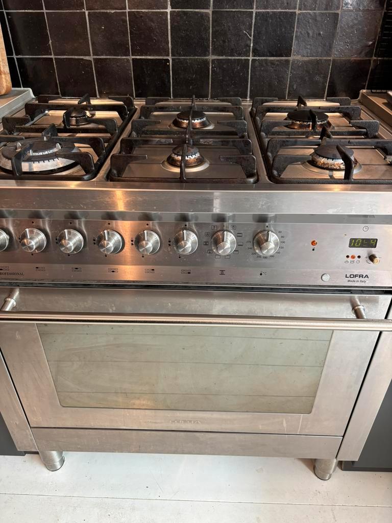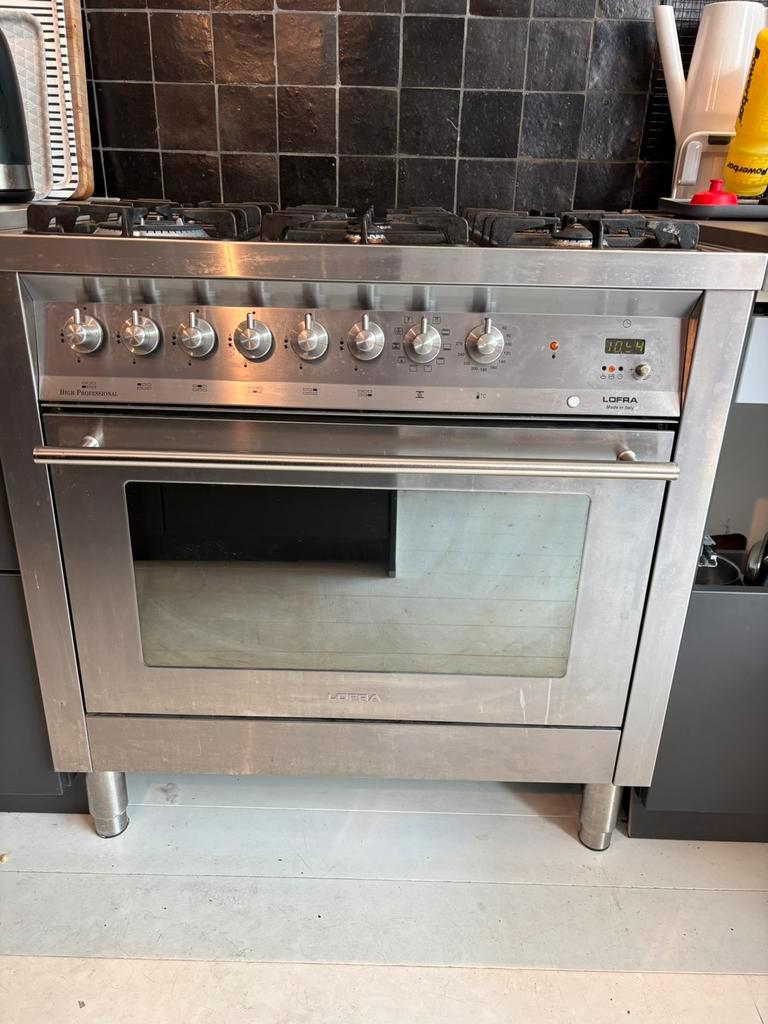 Gasfornuis met elektrische oven, ca. 10 Jaar oud. Afmeting: 90 cm breed en 50 cm diep. Merk is lofra. De oven doet het niet meer, kan makkelijk gerepareerd worden. Het display van de timer/ klokje is