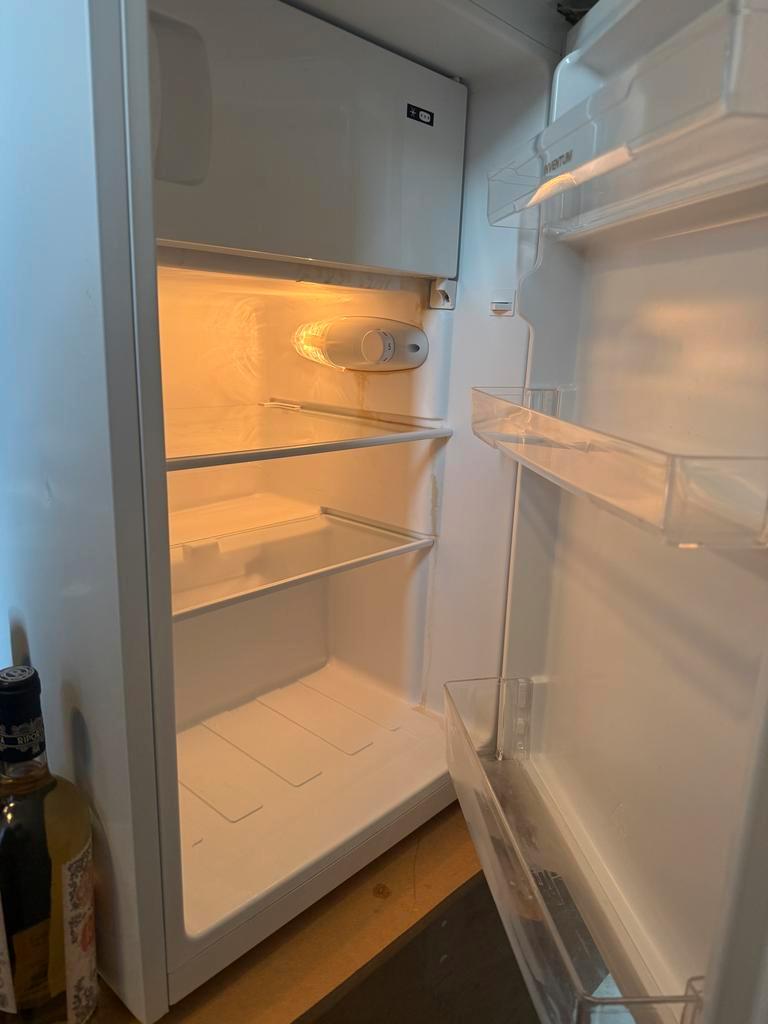 Koelkast functioneert, maar uit de vriezer loopt een zeer sterk geurende, bruine substantie. Ik vermoed dat dat op te lossen is door een handig persoon. Koelkast koelt, vriesvak durf ik niet te zeggen