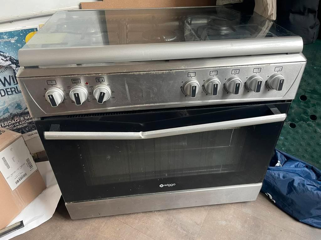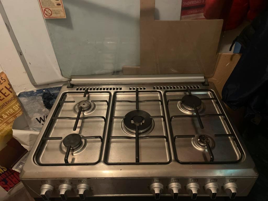 5 pits gasfornuis met oven. Het gasfornuis heeft lekstroom, maar als je handig bent zou het te repareren kunnen zijn. De hendel van de oven is ook gebogen en er missen 2 zwarte plaatjes op de gaspitje