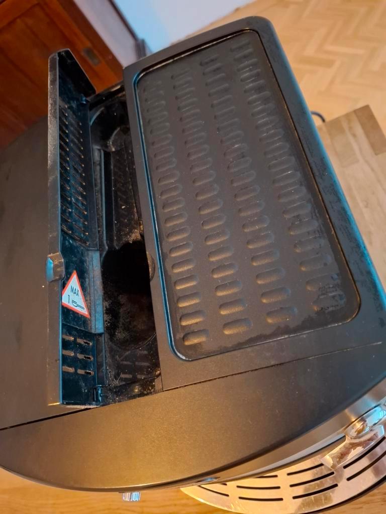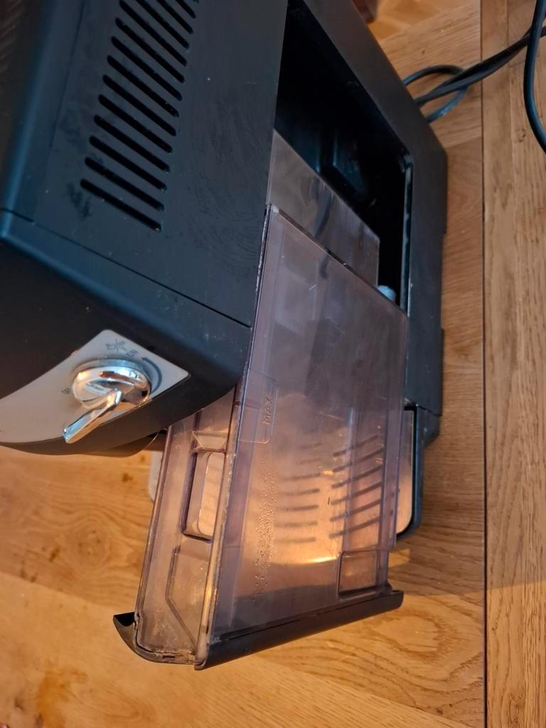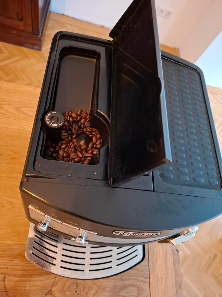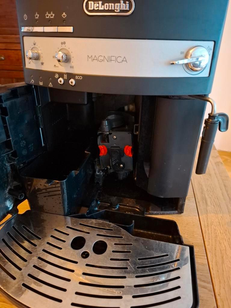 Zwarte koffiemachine delonghi magnifica voor koffiebonen en/of gemalen koffiebonen, met stoompijpje. Is intensief gebruikt (en na het laatste recente gebruik nog niet grondig schoongemaakte) maar func