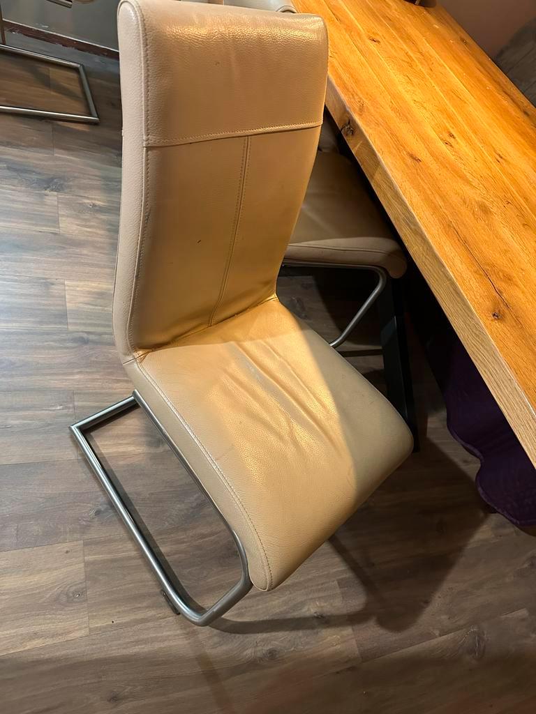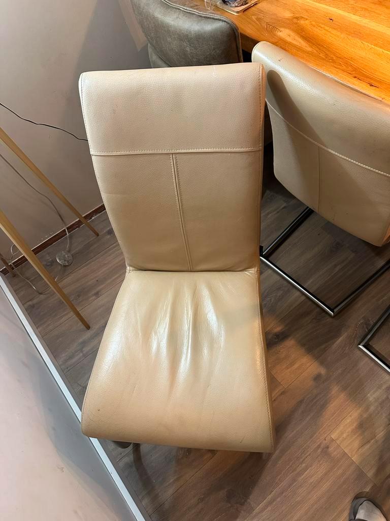 Mooie eetkamerstoelen met een beige lederen zitting en rugleuning. Het frame is gemaakt van chroom. De stoelen zijn in gebruikte staat,