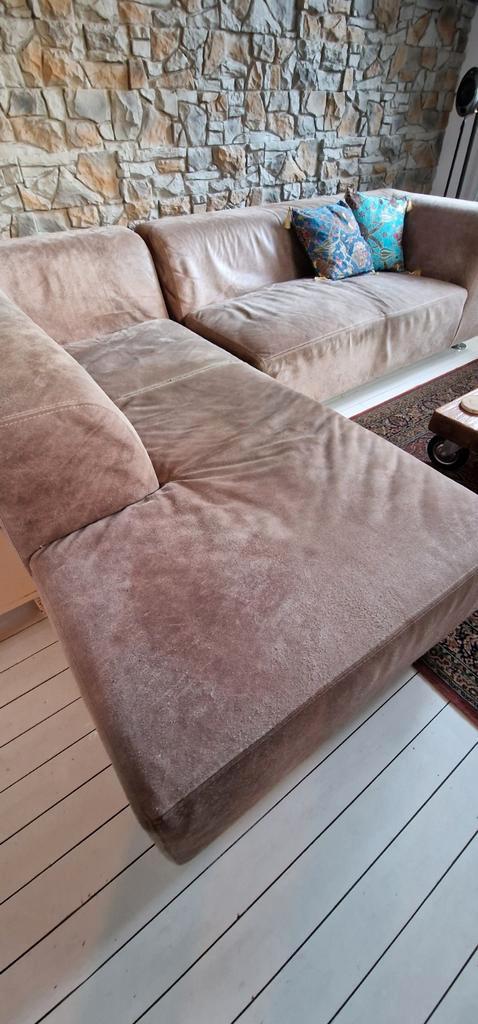 Mooie, robuuste hoekbank van dik, opgeruwd runderleer. De bank bestaat uit twee losse delen die eenvoudig tegen elkaar geschoven kunnen worden. Afmetingen: 200cm x 270cm x 70cm. De bank heeft een loss