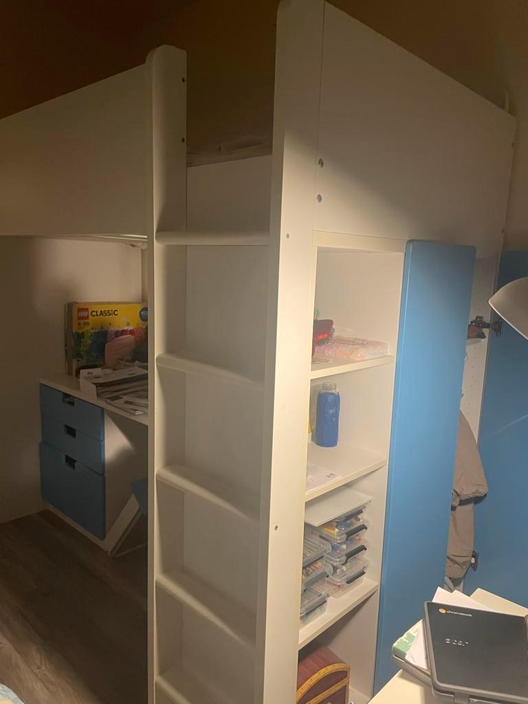 Deze halfhoogslaper is ideaal voor kinderkamers met beperkte ruimte. Het bed biedt een comfortabele slaapplek en daaronder is er een bureau en opbergruimte. Het bed is in gebruikte, maar goede staat.