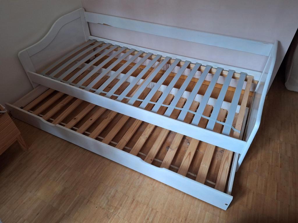 Wit houten uitschuifbed in redelijke staat. Ideaal voor een logeerkamer of kinderkamer. 2 Matrassen inbegrepen, de ene prima, wel met een (uitwasbare?) Vlek. De andere ouder. Afmetingen: breedte 90 cm