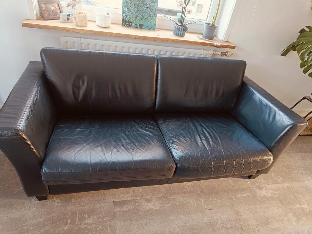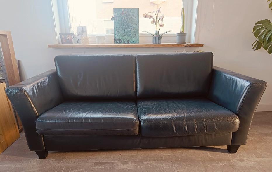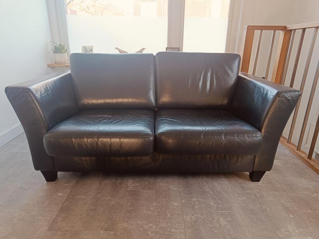 Gebruikt maar in goede staat verkerende 2 & 2.5 -Zits banken van zwart leer. De 2 zits heeft een afmeting van 160 cm breed x 85 cm diep en de 2.5 Zits is 180 cm breed x 85 cm diep. Beide banken he