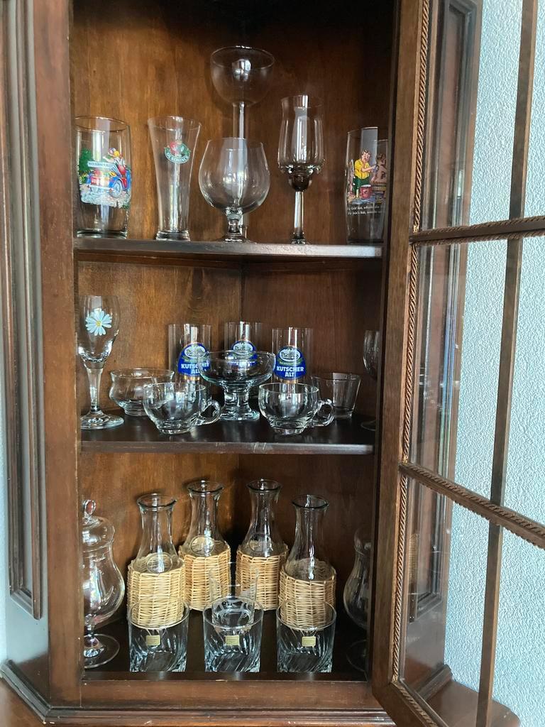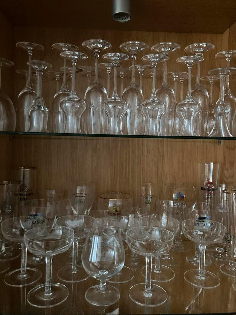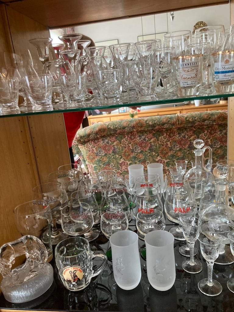 Mooie collectie glazen, bestaande uit diverse soorten en maten. Bijvoorbeeld (deels kristallen) wijnglazen. Tevens whisky-, bier- en borrelglazen. Maar ook dessert- of ijscoupes. Alles in goede staat.