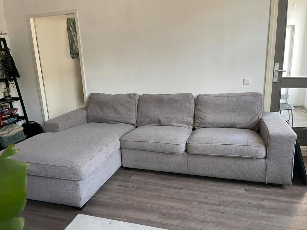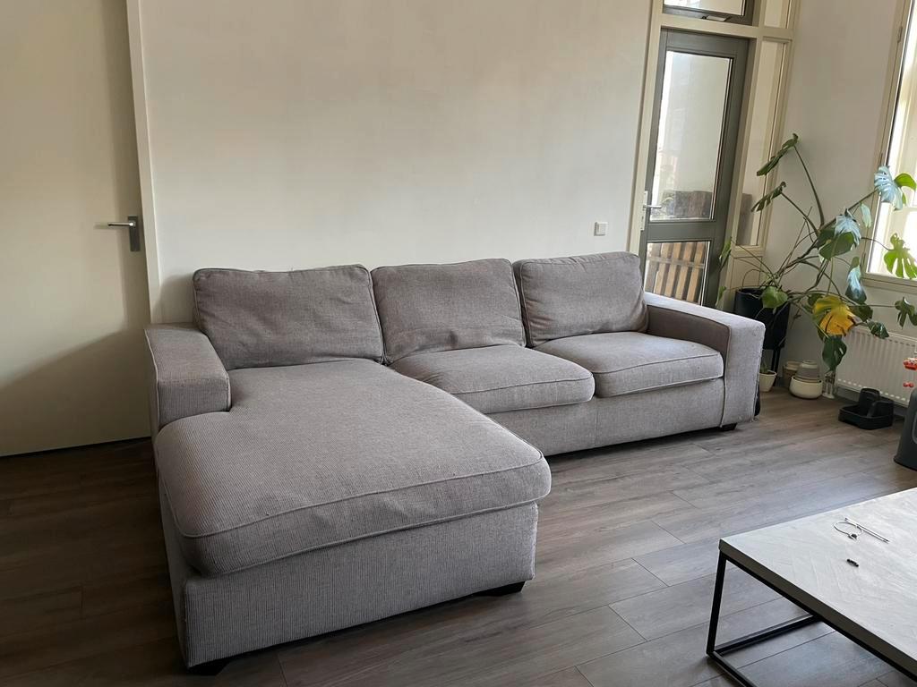 Veel gebruikte, maar ontzettend comfortabele hoekbank. 3 Meter breed, zitstuk is 1,05 meter, het ligstuk is 1,80 meter en de bank is 50 cm hoog. Bestaat uit 2 losse onderdelen (het ligstuk en het zits