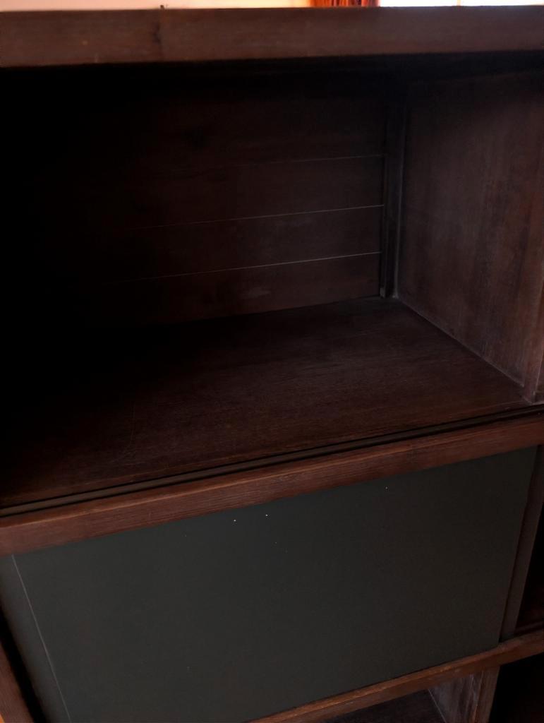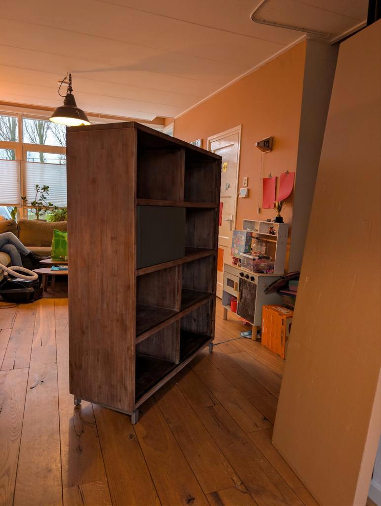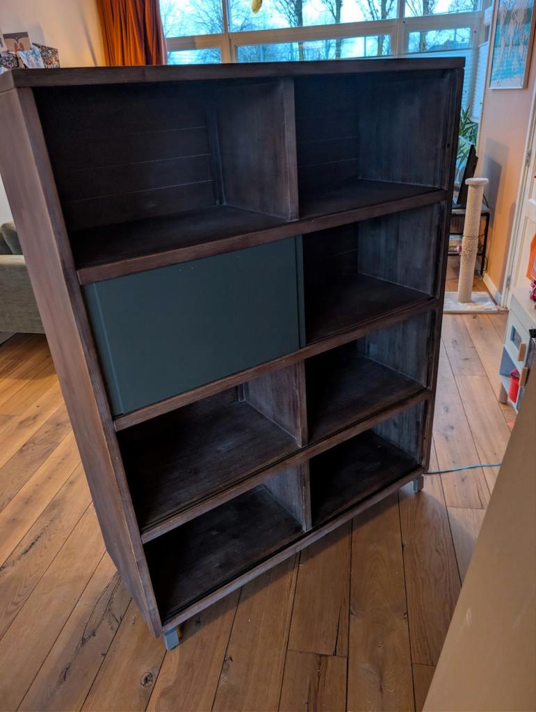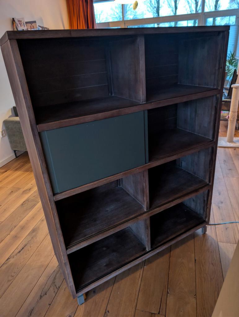 Mooie wandkast met open vakken en extra schuifdeuren. Ideaal voor het opbergen van spullen en het tonen van decoraties. De kast is in goede staat en biedt veel opbergruimte. De schuifdeuren zorgen erv