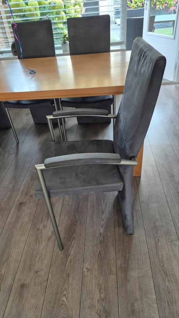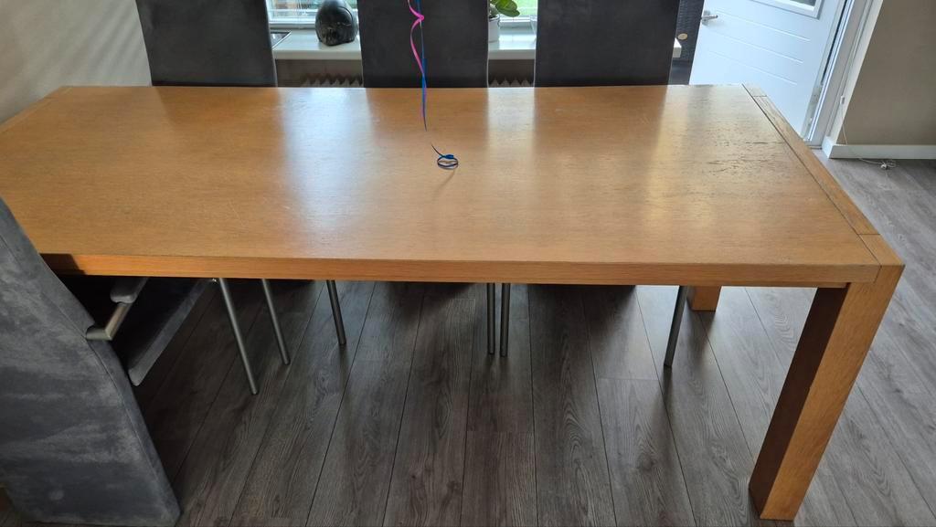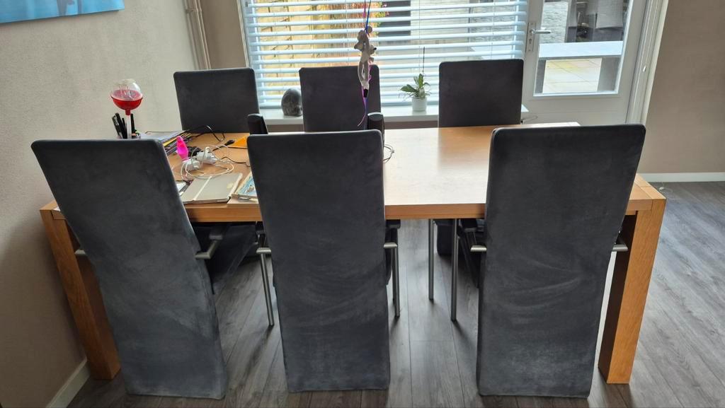 6 eetkamerstoelen met tafel eetkamer tafel langwerpig met gebruiksporen afmeting tafel 210 x 90 cm eetkamerstoelen zitting en rug van stof op halen gratis
