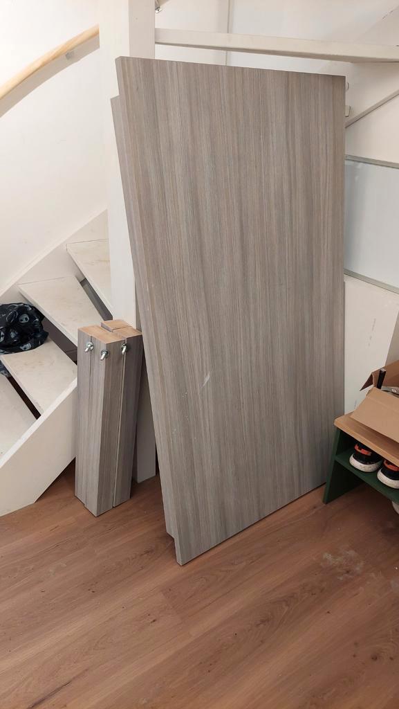 Gratis tafel die gemakkelijk te monteren is. Is een tijd lang gebruikt tijdens het klussen in onze nieuwbouwwoning. Daardoor zitten er verf vlekjes op. Kan nog prima dienst doen in een schuur of voor