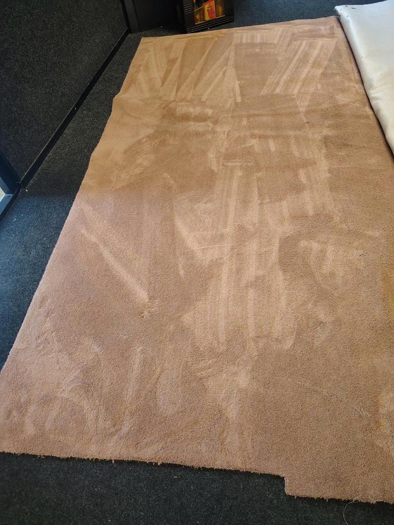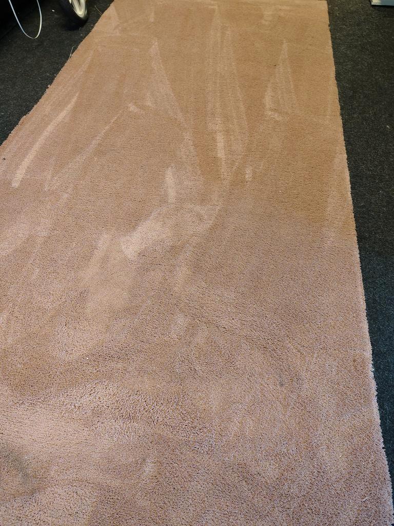 Mooi roze tapijt, bestaande uit twee stukken. Een stuk is 1.10 Meter bij 3 meter, het andere stuk is ongeveer 4 meter bij 3 meter. Er zitten hier en daar kleine vlekjes op, zoals te zien is op de foto