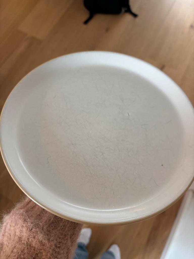Set van 8 witte (diner) borden met een subtiel beige randje. Ideaal voor dagelijks gebruik of speciale gelegenheden. Makkelijk te combineren met ander servies. De borden hebben wat krasjes van het sni